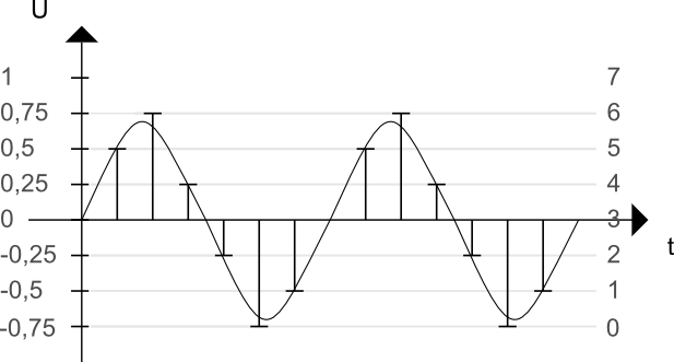 Im obigen Beispiel wird das Intervall [-1V;+1V] in 8 verschiedene (gleich große) Intervalle zerlegt: Ein Wert aus