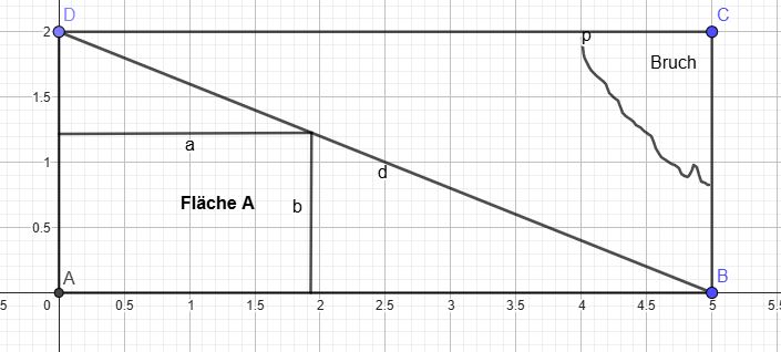 8. Azubi Karl-Theodor hat mal wieder Mist gebaut. Die rechteckige 5 m lange und 2 m breite Glasplatte ist am oberen rechten Rand gebrochen! Um den Schaden möglichst klein zu halten, schneidet er entlang einer Diagonalen die Platte.