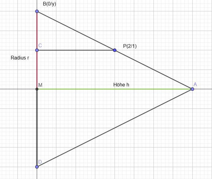 9. Welche Gerade durch P(2/1) begrenzt mit den positiven Koordinatenachsen ein Dreieck, das bei Rotation um die x-Achse einen Kegel mit minimalem Rauminhalt erzeugt?