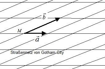Die Basis B von Gotham City besteht aus den Basisvektoren und .a) Bilden Sie die Transformationsmatrix, die kartesische Koordinaten in Gotham-Koordinaten umrechnet. b) Ermitteln Sie die Gotham-Koordinaten von M, E und R. c) Wie muss sich folglich der Landetrupp in den Straßen von Gotham City bewegen?