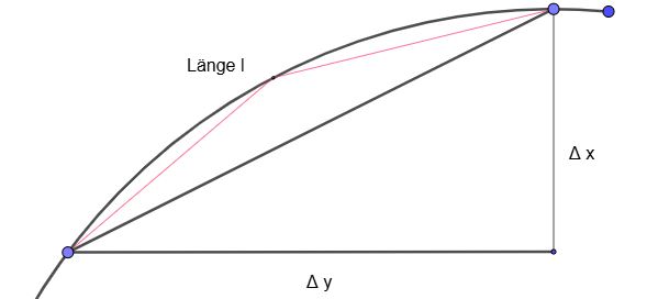 zu a) ![]() Analog zur Bestimmung der Fläche unterhalb eines Graphen kann auch die Länge eines Graphen im Intervall [a,b] ermittelt werden. In diesem Fall wird der Bogen durch die Länge der Sekante angenähert. Durch Grenzwertbildung gelangt man zum Ergebnis. Länge der Sekante im Intervall [a,b]: \(l=(\sqrt{(\Delta x)^2 + (\Delta y)^2} = \sqrt{1+\left(\frac{\Delta y}{\Delta x}\right)^2 }\cdot \Delta x\) Das Intervall [a,b] wird nun in n Teilintervalle zerlegt und die Länge des Bogens l als Summe der Teilintervalle geschrieben. Lässt man die Anzahl der Teilintervalle gegen unendlich gehen und schreibt Δ als d, gelangt man zur Integraldarstellung \(l=\int_{a}^{b} \sqrt{1+(f '(x))^2}dx\) (*). Angewendet auf die gegebene Funktion f im Intervall [2;3] mit f '(x) = \(\sqrt{x}\): \(l=\int_{2}^{3} \sqrt{1+(f '(x))^2}~dx~=~\int_{2}^{3} \sqrt{1+x}~dx~=~\frac{2}{3}\cdot(1+x)^{\frac{3}{2}}~|_{2}^{3}\)\(~=~\frac{2}{3}\cdot(4^{\frac{3}{2}}-3^{\frac{3}{2}})\approx1,87\) zu b) ![]() Die Krümmung K ist definiert als das Verhältnis von Winkeländerung Δ α zu Bogenlänge l = Δ s: K = \(lim \frac{\Delta\alpha}{\Delta s}\). Der Krümmungsradius R entspricht dem Kehrwert der Krümmung K: R = \(\frac{1}{K}\) Je stärker die Krümmung ist, desto kleiner ist der Krümmungsradius. Es gilt: K(x) = \(\frac{f ''(x)}{(1+(f '(x))^2)^{\frac{3}{2}}}\) Sonderfälle sind Wendepunkte, denn dort gilt f ''(x) = 0. Herleitung: K(x) = \(\frac{\Delta\alpha}{\Delta s}=\frac{\Delta\alpha}{\Delta x}\frac{\Delta x}{\Delta s}\). Für den Faktor \(\frac{\Delta x}{\Delta s}\) gilt \(\frac{\Delta x}{\Delta s} = \frac{1}{\sqrt{1+(f '(x))^2}}\), denn dieser Faktor ist einfach der Kehrwert der Ableitung der Bogenlänge l =Δ s - einfach das Argument des Integrals verwenden s. oben(*). Für den Faktor \(\frac{\Delta\alpha}{\Delta s}\) bemüht man die Ableitung des arctan und die Kettenregel. Allgemein: f '(x) = tan α und deshalb α = arctan f '(x). Deshalb: \(\frac{\Delta\alpha}{\Delta x}~=~\frac{f ''(x)}{1+(f '(x))^2}\) Alles einsetzen: K(x) = \(\frac{\Delta\alpha}{\Delta x}\frac{\Delta x}{\Delta s}~=~\frac{f ''(x)}{1+(f '(x))^2} \cdot \frac{1}{\sqrt{1+(f '(x))^2}}~=~\frac{f ''(x)}{(1+(f '(x))^2)^{\frac{3}{2}}}\) Nun wird f bzw. f ' und f '' in die Gleichung für die Krümmung eingesetzt: K(x) = \(\frac{f ''(x)}{(1+(f '(x))^2)^{\frac{3}{2}}}~=~\frac{6x}{(1+9x^4)^{\frac{3}{2}}}\) Um die Stelle stärkster Krümmung zu ermitteln, benötigt man die erste Ableitung von K: K'(x) = \(\frac{6\cdot(1+9x^4)^{\frac{3}{2}}-36x^3\cdot 1,5\cdot(1+9x^4)^{\frac{1}{2}}\cdot 6x}{(1+9x^4)^3}~=~\frac{6\cdot(1+9x^4)-324x^4}{(1+9x^4)^{\frac{5}{2}}}\)\(~=~\frac{6-270x^4}{(1+9x^4)^{\frac{5}{2}}}\) Notwendige Bedingung für ein Extremum ist K'(xE) = 0. Ein Bruch wird nur Null, wenn der Zähler Null wird. Deshalb: 6 - 270x4 = 0 → xE1,2 = ±\(\frac{1}{\sqrt[4]{45}}\approx \pm0,386\) An den Stellen ±0,386 ist die Krümmung des Graphen von f(x) = x3 am stärksten. Sie beträgt dort K(±0,386) ≈ ±1,76. Der Krümmungsradius ist R = \(\frac{1}{K}\approx0,567\). |