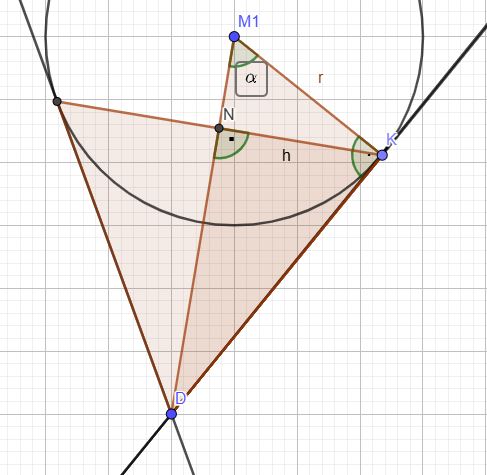 K ist ein Berührpunkt des Kegels an die Kugel. Die Höhe h des Dreiecks DKM1 entspricht dem Radius der Grundfläche des Tangentialkegels. Die Höhe des Tangentialkegels entspricht dem Abstand der Punkte N und D.