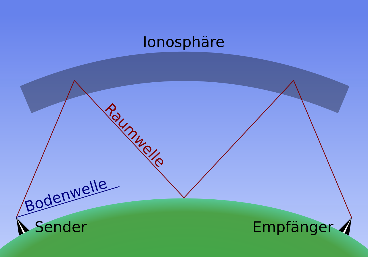 | - | AM-Sender starker Sendeleistung erzielen eine hohe Reichweite über mehrere 1000 km, weil die (Raum)Wellen an der Ionosphäre (Höhe > 80 km) insbesondere des Nachts gut reflektiert werden. |